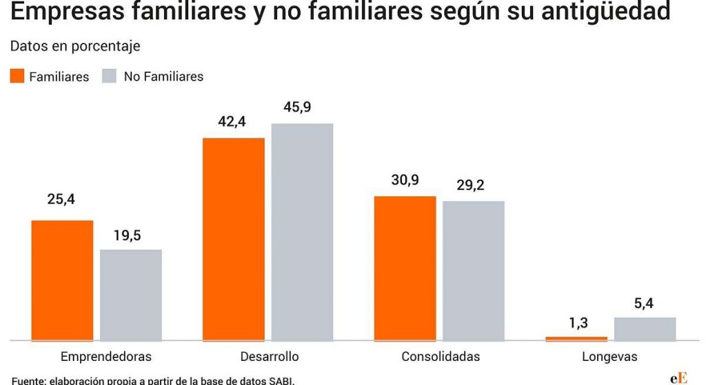 El estudio -que segmenta las empresas en emprendedoras, en desarrollo, consolidadas y longevas en función del tiempo que lleven activas- identifica que una de cada 4 empresas familiares se encuentra aún en una fase “emprendedora”, con menos de 10 años de antigüedad. Asimismo, más del 40% se encuentran aún en primera generación y sólo una de cada tres han superado al menos un primer proceso de relevo generacional. En comparación con las no familiares, se observa que las empresas familiares predominan entre las nuevas y en el de consolidadas. Por el contrario, las no familiares las superan en los estratos de empresas en desarrollo y longevas. El análisis de la tasa de supervivencia de las empresas familiares empleadas en el estudio sobre La Empresa Familiar en España (2015) pone de manifiesto que la supervivencia de las empresas familiares supera en casi 4 puntos porcentuales a la de las empresas no familiares.