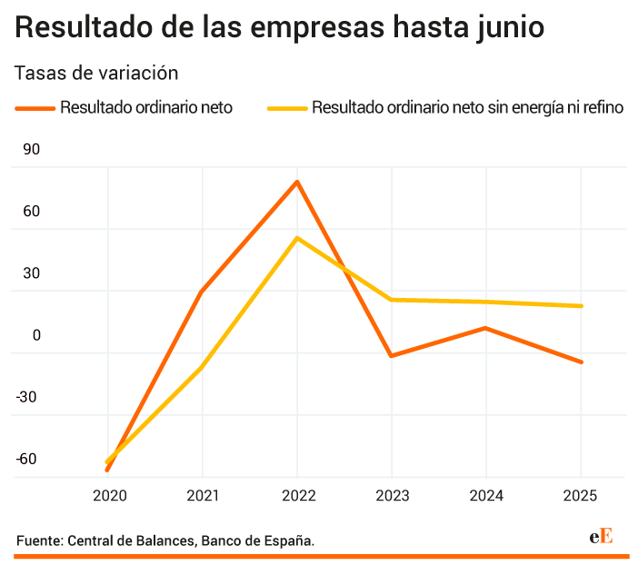 Según explica el organismo en la nota de prensa “esta caída se explica, principalmente, por el comportamiento negativo de los sectores de la energía y del refino de petróleo, especialmente de este último, que tienen un peso muy elevado en la muestra”. Hasta junio, los sectores de energía e industria registraron un desplome en sus beneficios del 21% y el 68%. La contracción del sector industrial se explica principalmente por el fuerte descenso del subsector de refino de petróleo, y en menor medida por las caídas observadas en los sectores de fabricación de material de transporte y de otras industrias manufactureras.
