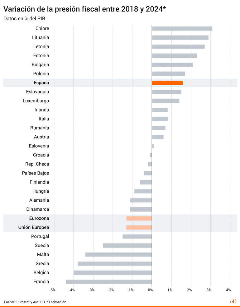 - La carga fiscal en España aumentó desde el año 2019 en casi dos puntos del PIB