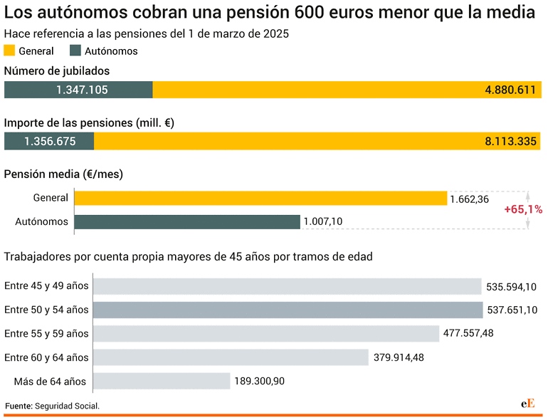 Así los datos publicados por el ministerio de Seguridad Social, y que hace referencia a la cuantía de las pensiones del mes de marzo, la media de las pensiones en España se sitúa en los 1.662,36 euros mensuales, mientras que la de un trabajador autónomo apenas supera los mil euros -1.007,10 concretamente-, lo que supone un 65,1% menos al mes.