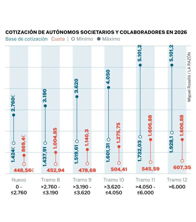Los autónomos familiares y societarios tendrán que pagar 135 € más al mes desde enero aunque no lo tengan que pagar hasta final de 2027 o inicio de 2028. Al saltarse esos 10 tramos les obligarán a pagar entre 869 y 1.606 euros extras al año en cuotas.