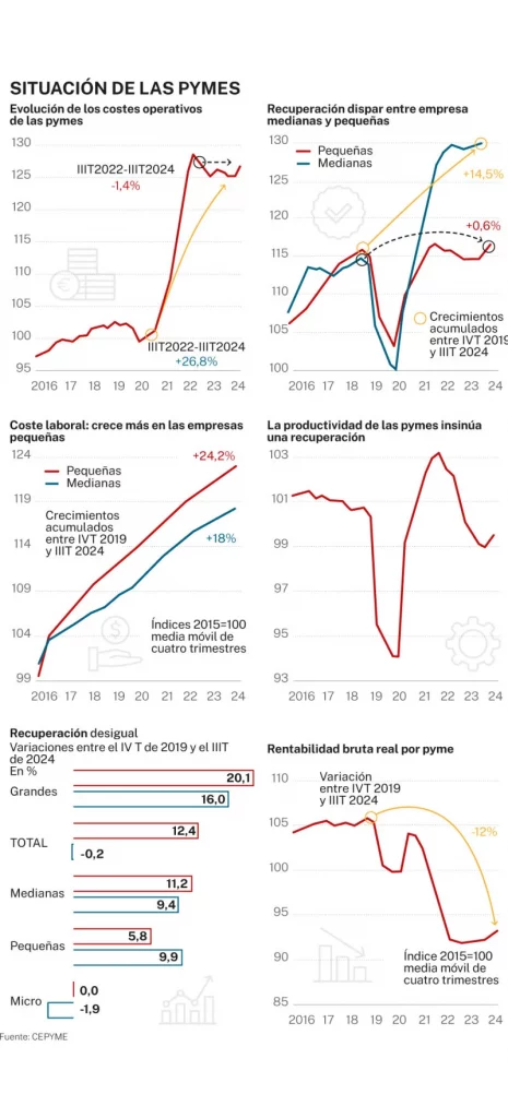 Según Cepyme, pese a la moderación de la inflación –en especial, del precio de la energía, que se redujo un 10,2% en el trimestre–, el repunte de las ventas de las pymes es «insuficiente para compensar los sobrecostes», lo que ha elevado los costes laborales hasta el tercer trimestre del año un 4,2%. Además, la productividad encadena siete trimestres de caídas interanuales y se sitúa lejos todavía de recuperar niveles prepandemia, y la rentabilidad se sitúa un 12% por debajo del nivel de 2019. Por ello, Cepyme reclama al Gobierno que apueste por la moderación de los costes laborales, que impacta de forma «especialmente dura» entre las microempresas, «las más sensibles ante medidas que afectan a los salarios, la contratación o la jornada», incide el informe, que aporta un dato revelador: el número de microempresas se ha reducido casi un 2% desde 2019 , con el empleo en esta tipología empresarial –que supone el 85% del parque con asalariados– congelado, «lo que constata una recuperación desigual según el tamaño de las compañías, en detrimento de las más pequeñas.