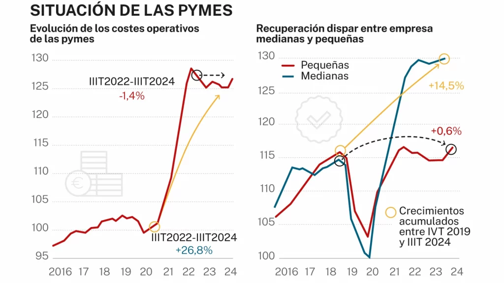 En cuanto a los costes operativos generales de las pymes, han experimentado cuatro bajadas interanuales recientes con dos leves subidas, pero persisten casi un 27% por encima del nivel del tercer trimestre de 2020. «La tendencia de estabilización en variaciones más moderadas deriva principalmente del descenso del 10,2% interanual en la energía, pese a seguir un 68,5% por encima del nivel prepandemia», indica el estudio. Si se compara el tercer trimestre de 2019 con el correlativo de 2024, la subida de los costes operativos para el conjunto de las pymes alcanza el 24,1%, siendo del 25,3% para las pequeñas y del 21,6% para las medianas –con un 36,7% más altos los insumos, 68,5% más cara la energía y 18,1% más altos los laborales–.