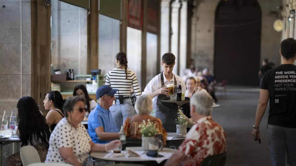 Barcelona 20/05/2025 Turistas turismo en Barcelona En la foto, grupo de turistas en una terraza de la Plaça Reial ( camarero empleo ocupación trabajo )Fotografía de Ferran Nadeu / Ferran Nadeu / EPC