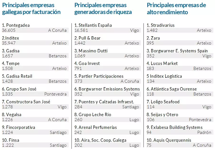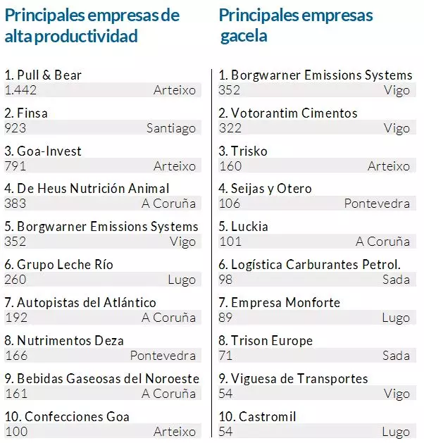 De nuevo, siete de las diez primeras radican en A Coruña, muchas vinculadas a la ingeniería, la energía, las TIC o la construcción especializada. Algunas de ellas son Pull & Bear, Finsa, Goa-Invest, De Heus Nutrición Animal, Bebidas Gaseosas del Noroeste o Confecciones Goa. Son actividades intensivas en conocimiento que elevan la productividad media y refuerzan la competitividad.